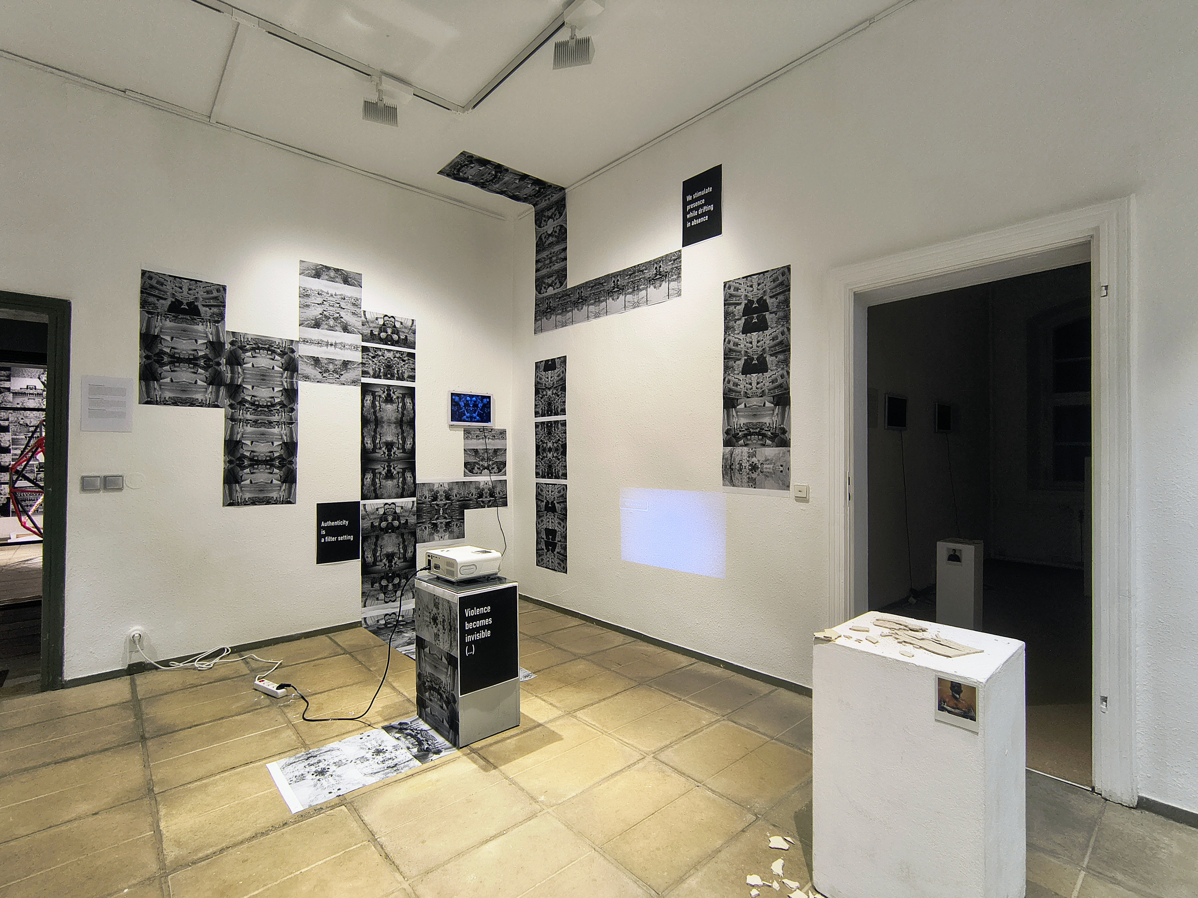 Environment powstał jako kolejna odsłona projektu podejmującego krytyczną refleksję nad hiperrealnością wojny. Odwołując się do myśli Jeana Baudrillarda, instalacja wskazuje na stan, w którym obrazy przemocy i cierpienia funkcjonują w obiegu jako symulakry – czyli przedstawienia oderwane od rzeczywistości, powielające i zastępujące ją do tego stopnia, że zaczynają tworzyć własną, autonomiczną rzeczywistość medialną. Materiał wizualny tworzą glitchowe rejestracje i found footage z massmediów relacjonujących wojnę w Ukrainie. Zanurzone w szumie, budują immersyjny pejzaż dezinformacji, przesytu i dezorientacji, która stała się bronią samą w sobie w rosyjskiej wojnie medialnej. Environment nie rekonstruuje faktów – odsłania stan znużenia, zobojętnienia graniczącego z irytacją. Obrazy i dźwięki w pętli tworzą doświadczenie natrętnej obecności, która paradoksalnie unieważnia samą wojnę – czyniąc z niej medialne widowisko, w którym realne ginie w nadmiarze.