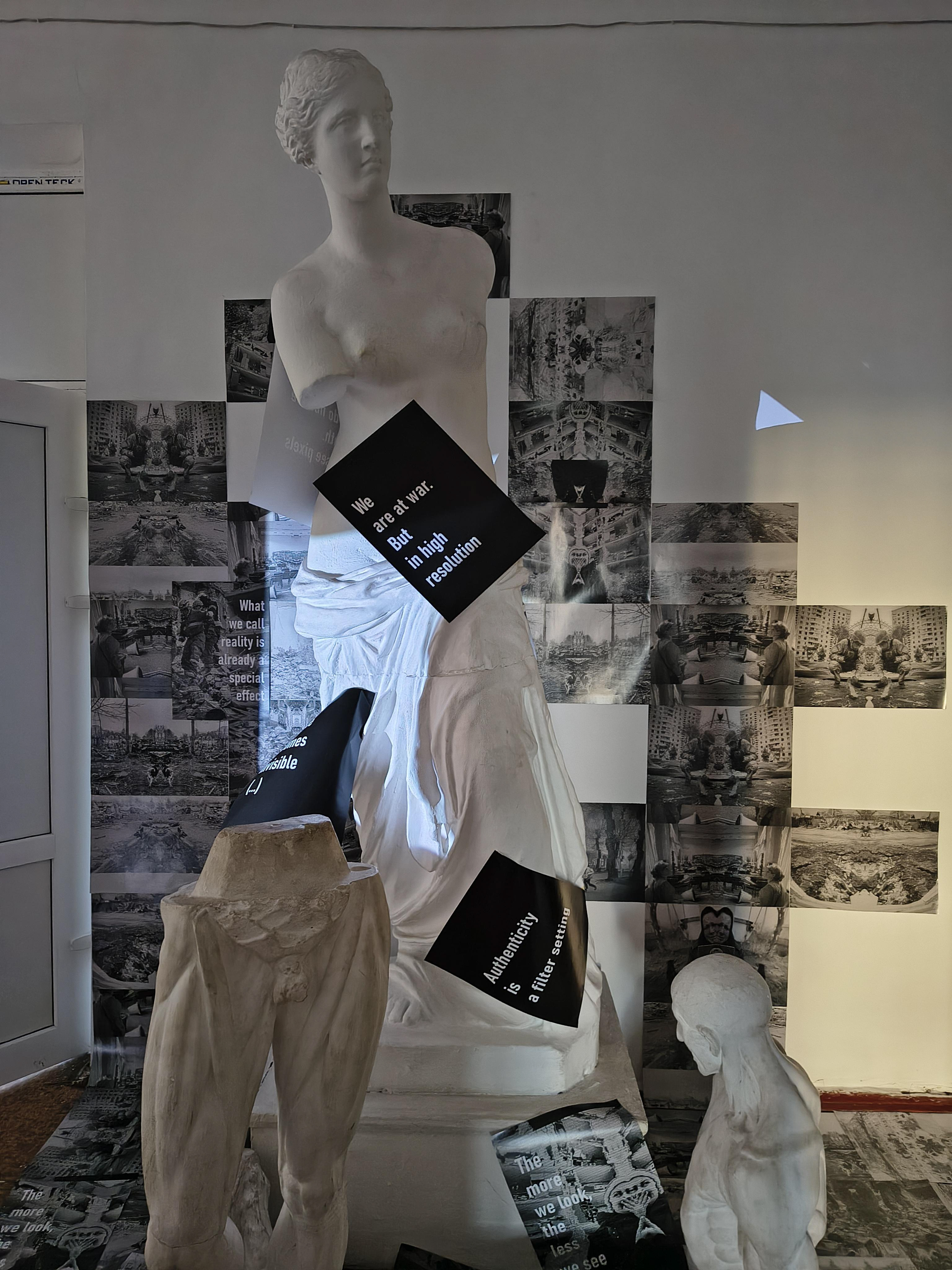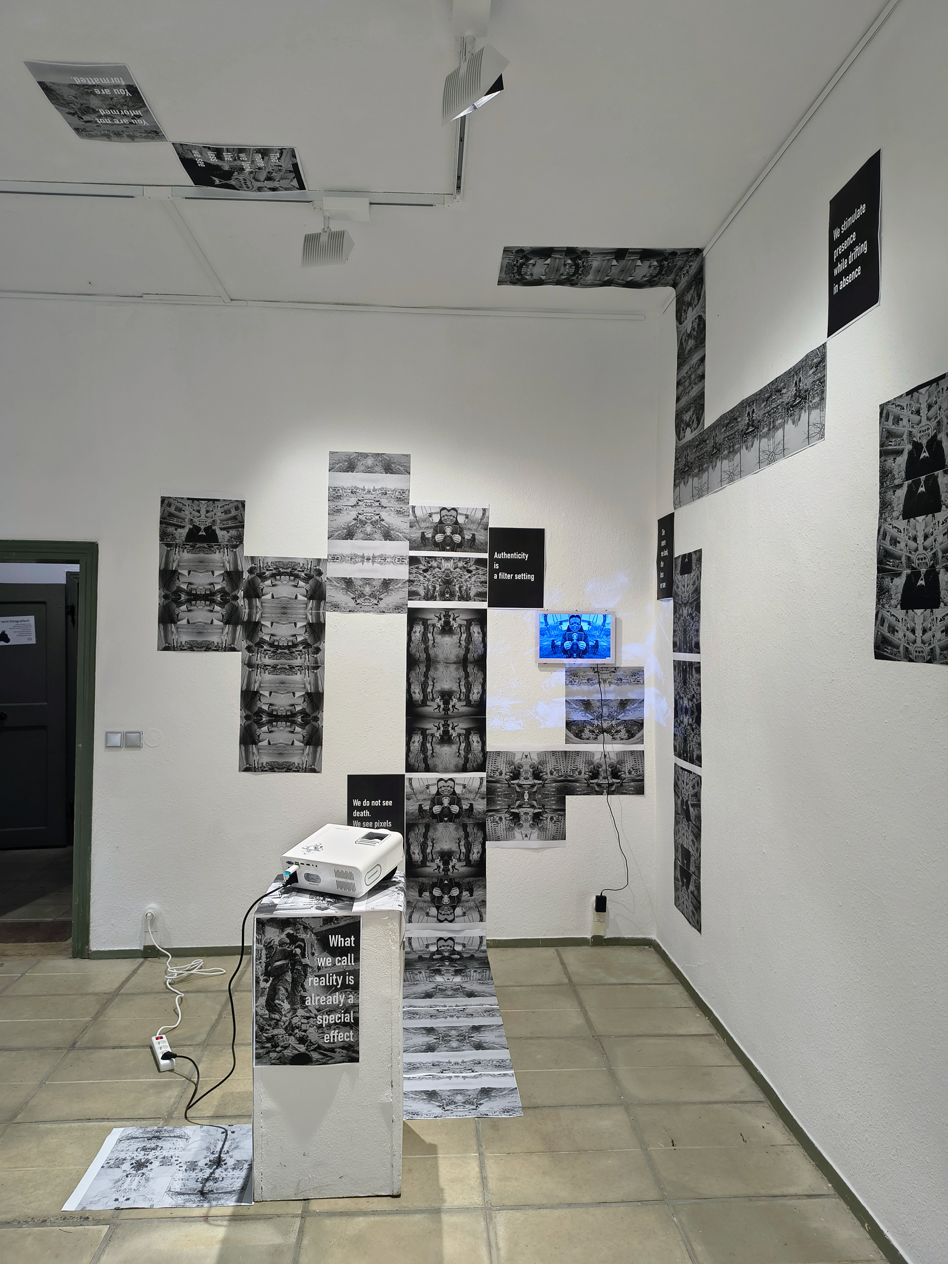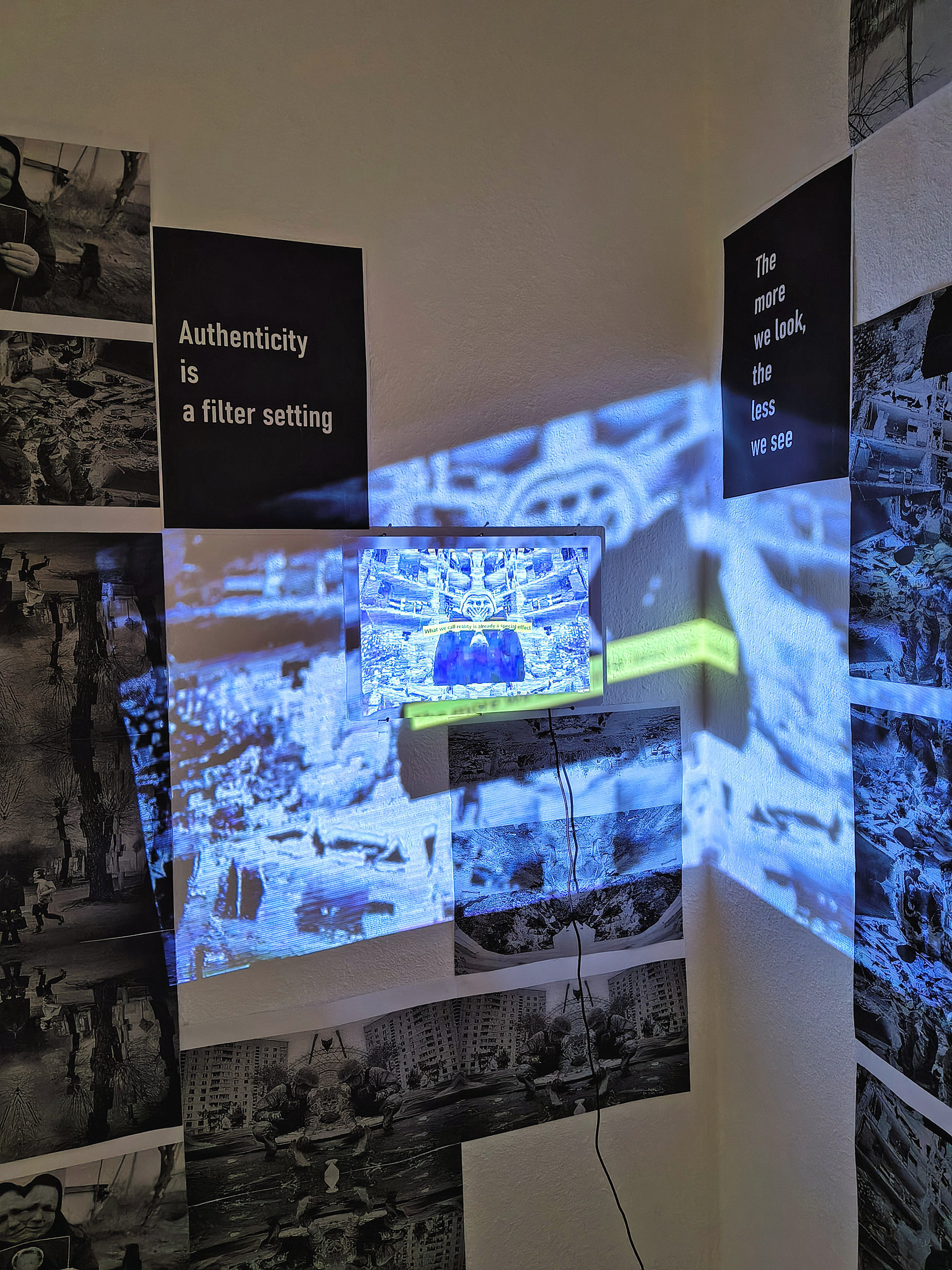The environment was conceived as a subsequent chapter of a project that develops a critical reflection on the hyperreality of war. Referring to Jean Baudrillard's thought, the installation points to a state in which images of violence and suffering circulate as simulacra — representations detached from reality, endlessly reproduced and replacing it to such an extent that they begin to form their own autonomous medial order. The visual layer consists of glitch-based recordings and found footage taken from mass-media coverage of the war in Ukraine. Immersed in noise and distortion, they create an atmospheric landscape of disinformation, excess, and disorientation — affective strategies that have themselves become weapons in Russia’s media war. The environment does not reconstruct facts. Rather, it reveals a condition of fatigue and indifference, at times bordering on irritation. Images and sounds, arranged in continuous loops, produce an experience of intrusive presence that — paradoxically — empties the war of its meaning, turning it into a mediated spectacle in which the real disappears under the weight of its own excess.