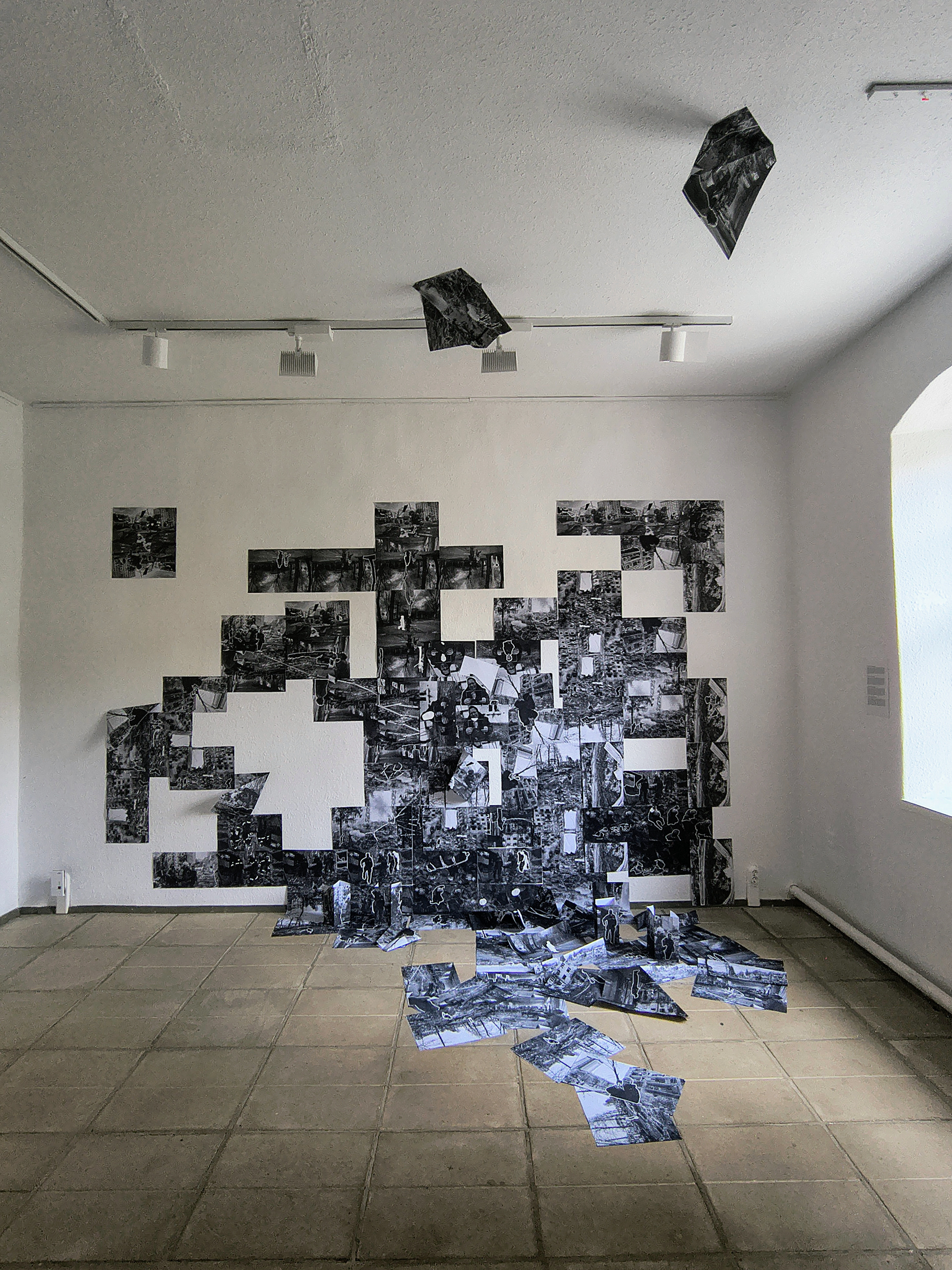 The project utilizes glitch-based recordings and mass-media images of the war in Ukraine, which are then multiplied. Here, fragmentation and disintegration prevail: the images disperse like astral dust within an open structure that constantly destabilizes and negates representation. The paper medium becomes a carrier of destruction: repeated frames fracture, lose their integrity, and their surface crumbles and fades. The use of a white contour extracts fragments from the black-and-white copies, exposing the emptiness of the message and revealing the ambiguity of representation itself.
