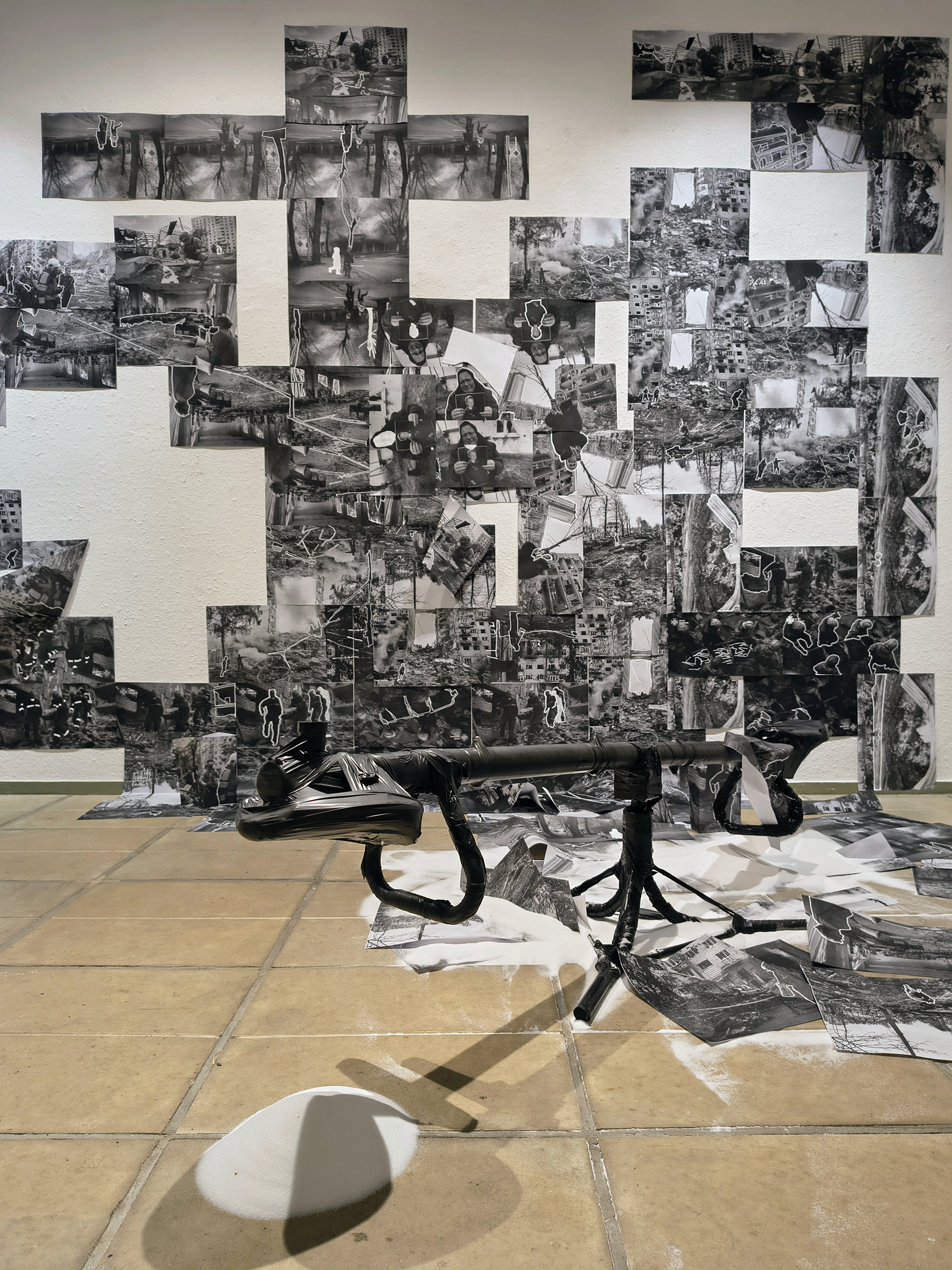 This gesture situates the work within the tradition of contemporary collage and the aesthetics of the absurd, while also exposing their hypocrisy – the mechanical reproduction of war imagery which, as Walter Benjamin wrote, loses its aura and becomes a hollow sign torn from context, relentlessly consuming the drama of reality. The installation does not offer a complete image; instead, it reveals a process of semantic decay and fragmented attention, in which war transforms into a nebula of reproductions devoid of coherence, suspended between real experience and its simulation.