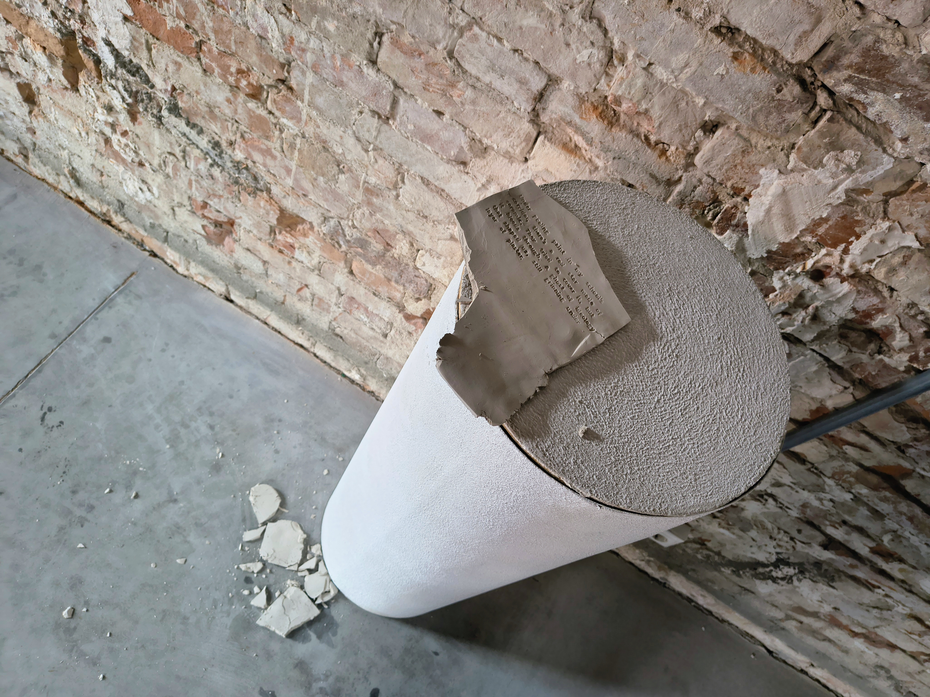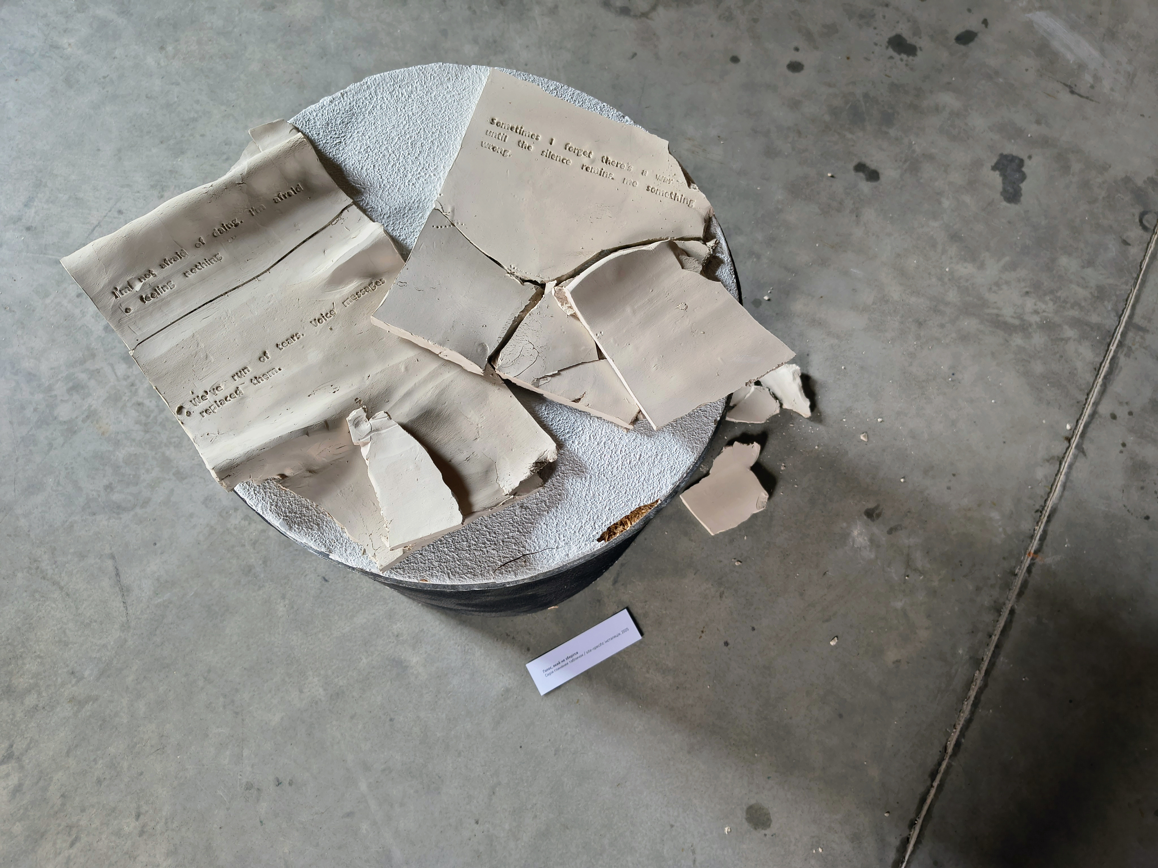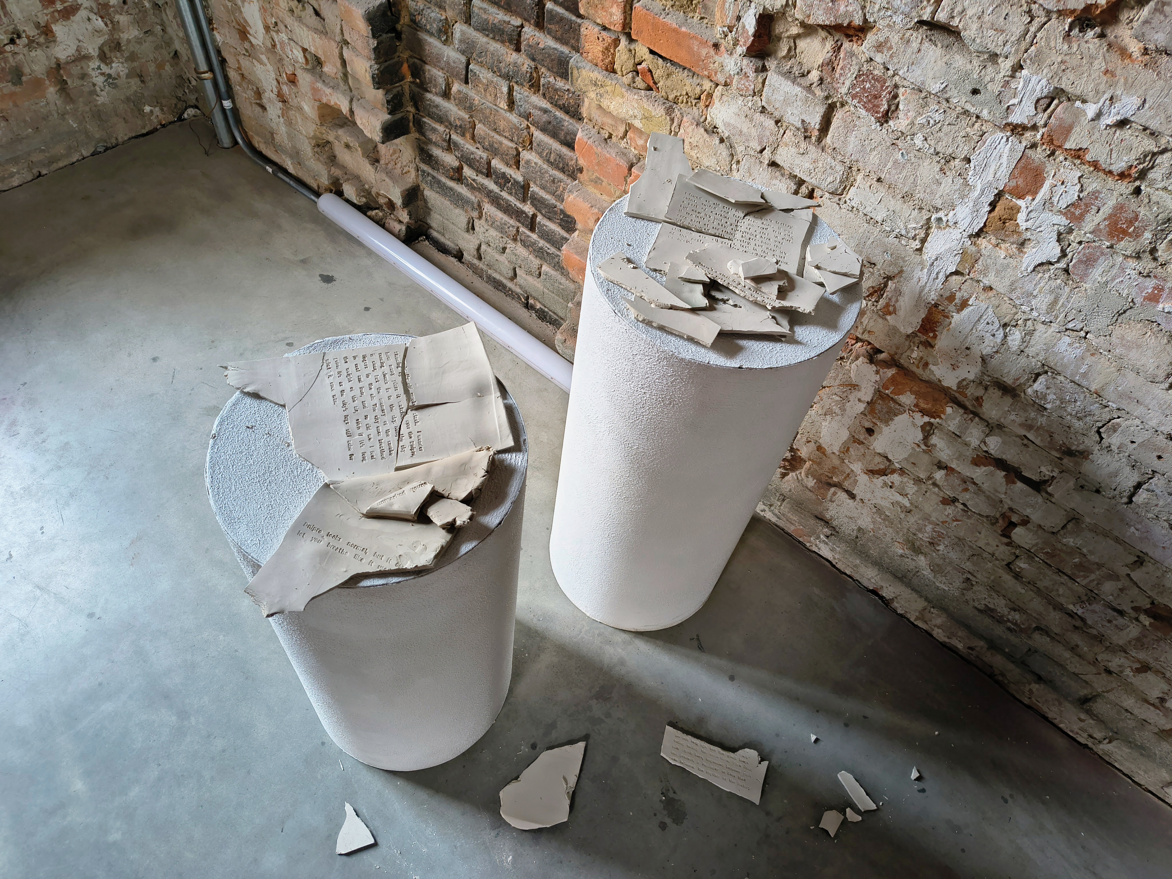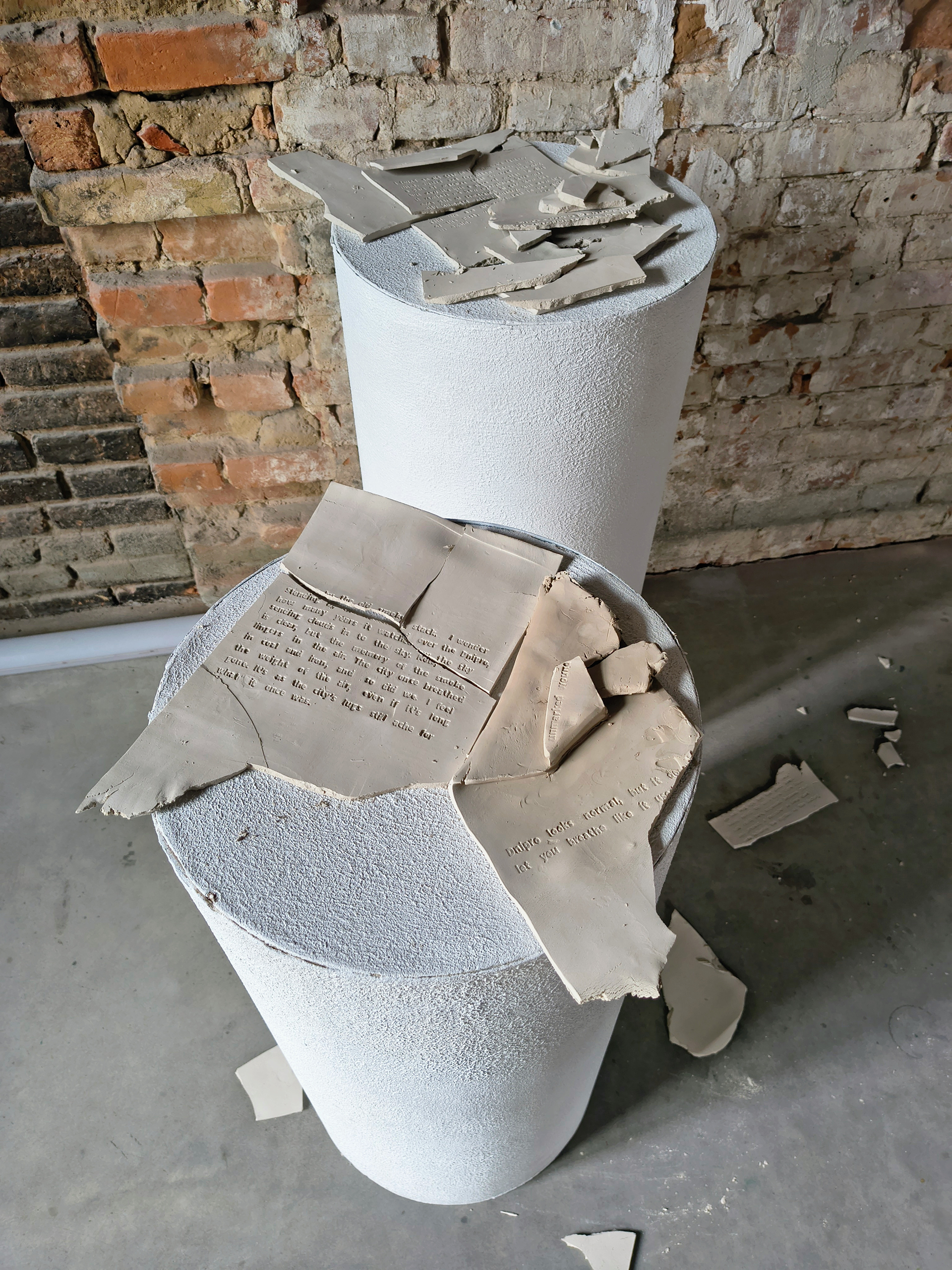 The Voice That Did Not Survive (2025, ceramic objects Hundreds of clay tablets — many broken — contain relief imprints of statements by Dnipro residents: about the city’s industrial past, Soviet colonization, and the present experience of war. This is an archive that will not survive, one that speaks precisely through its impermanence. The question is: can one speak if the medium disintegrates in one’s hands? Can memory survive as a fracture?