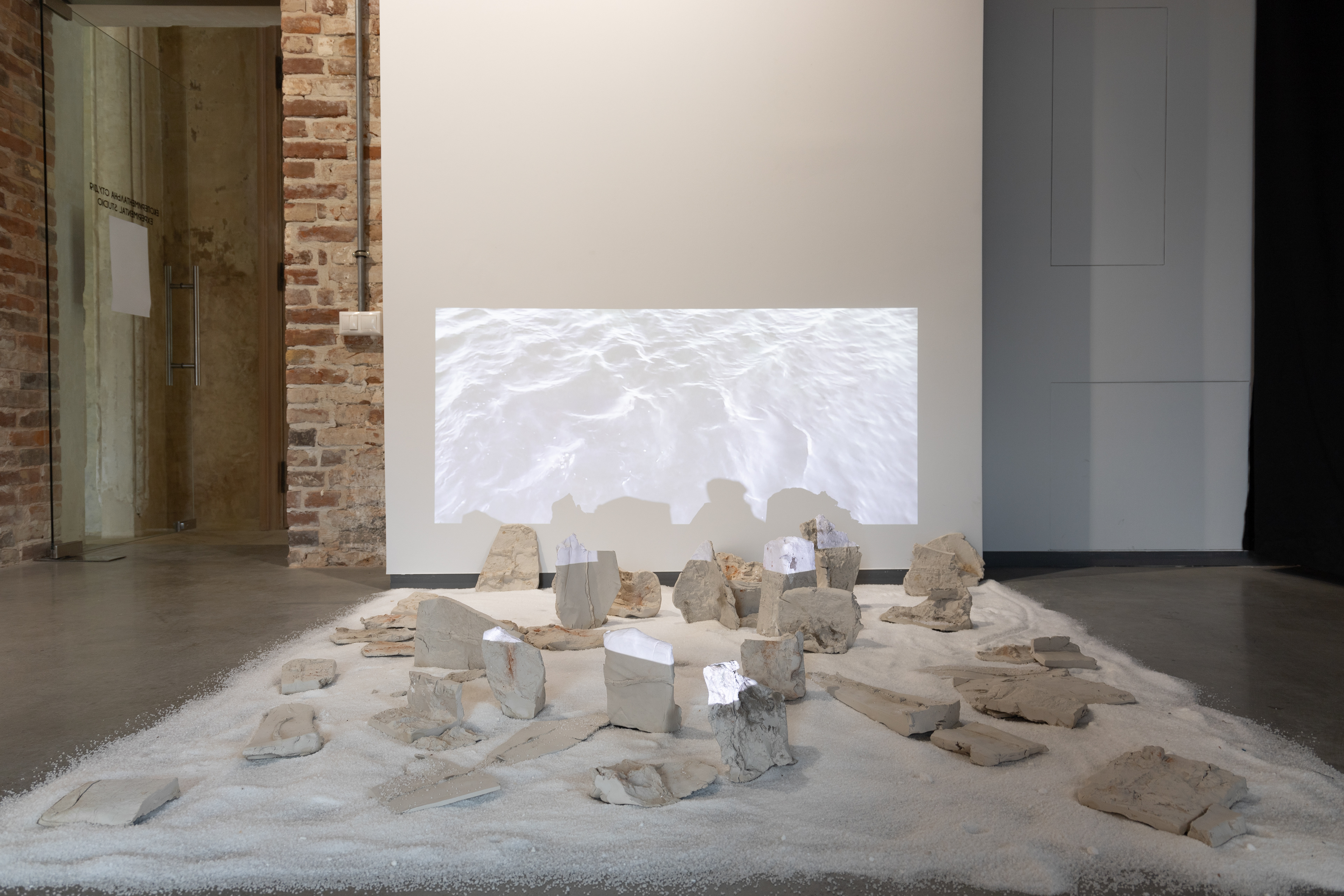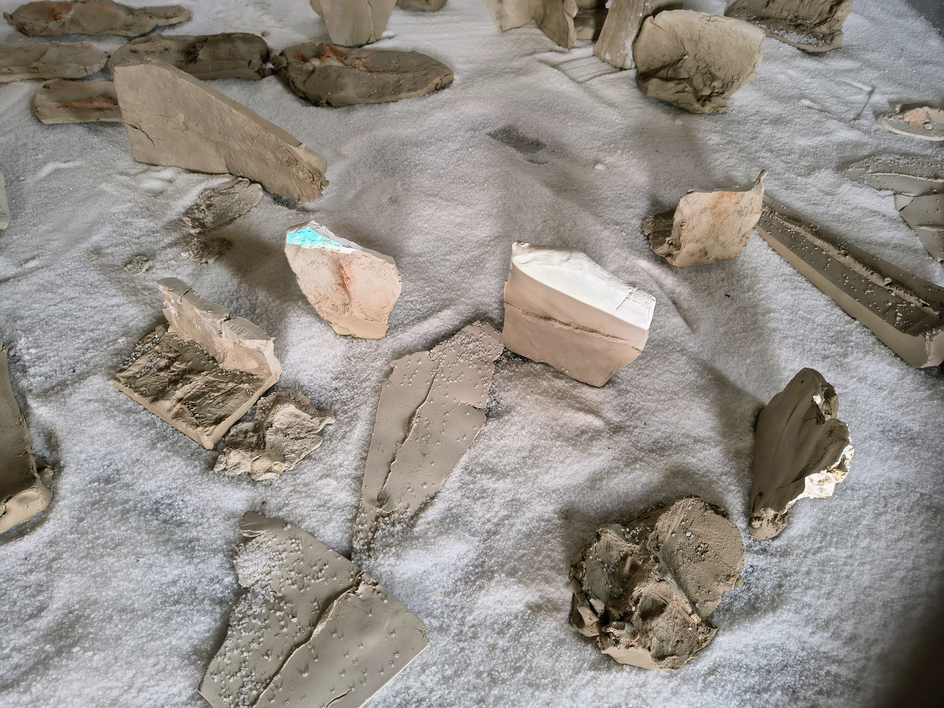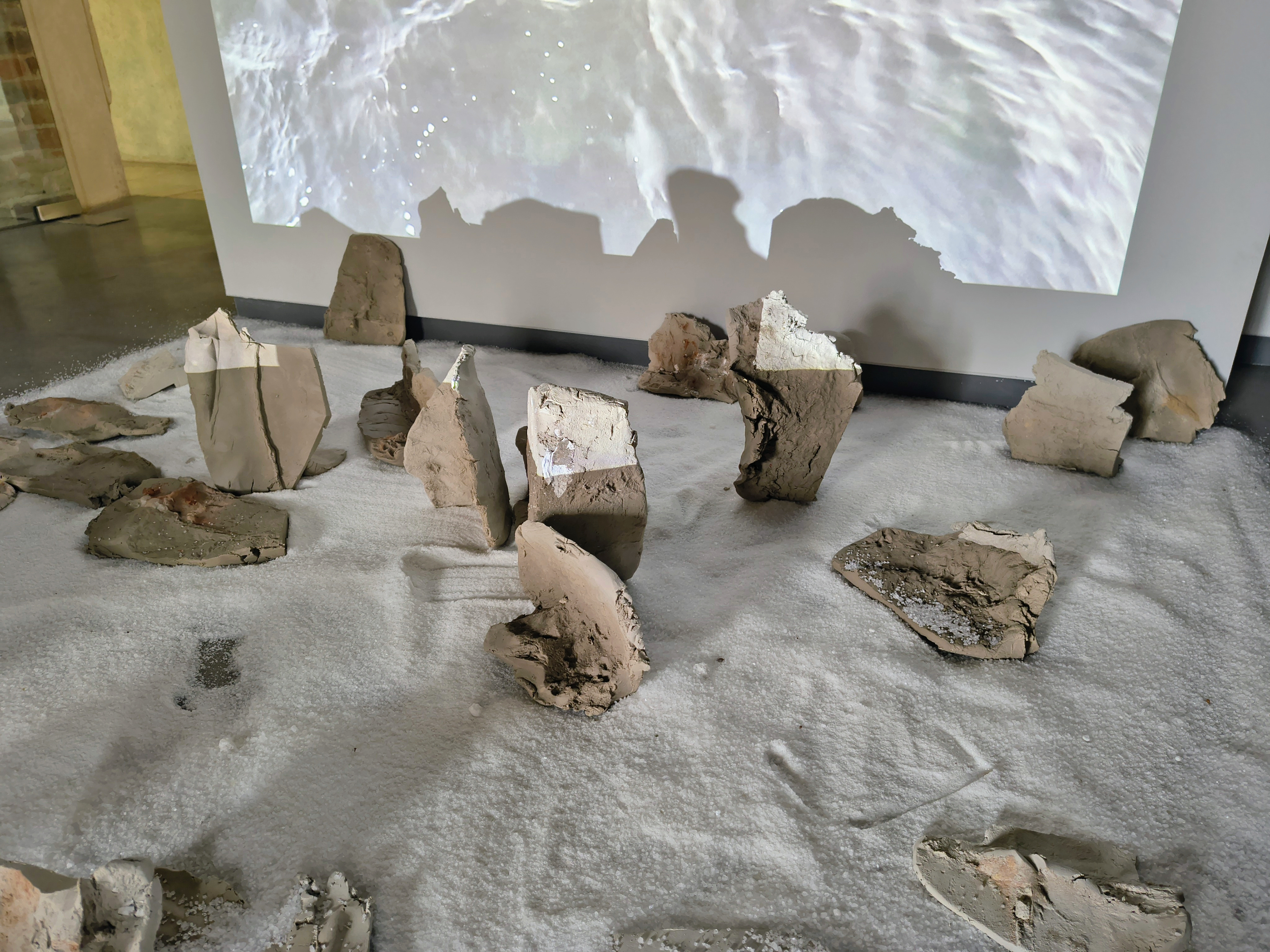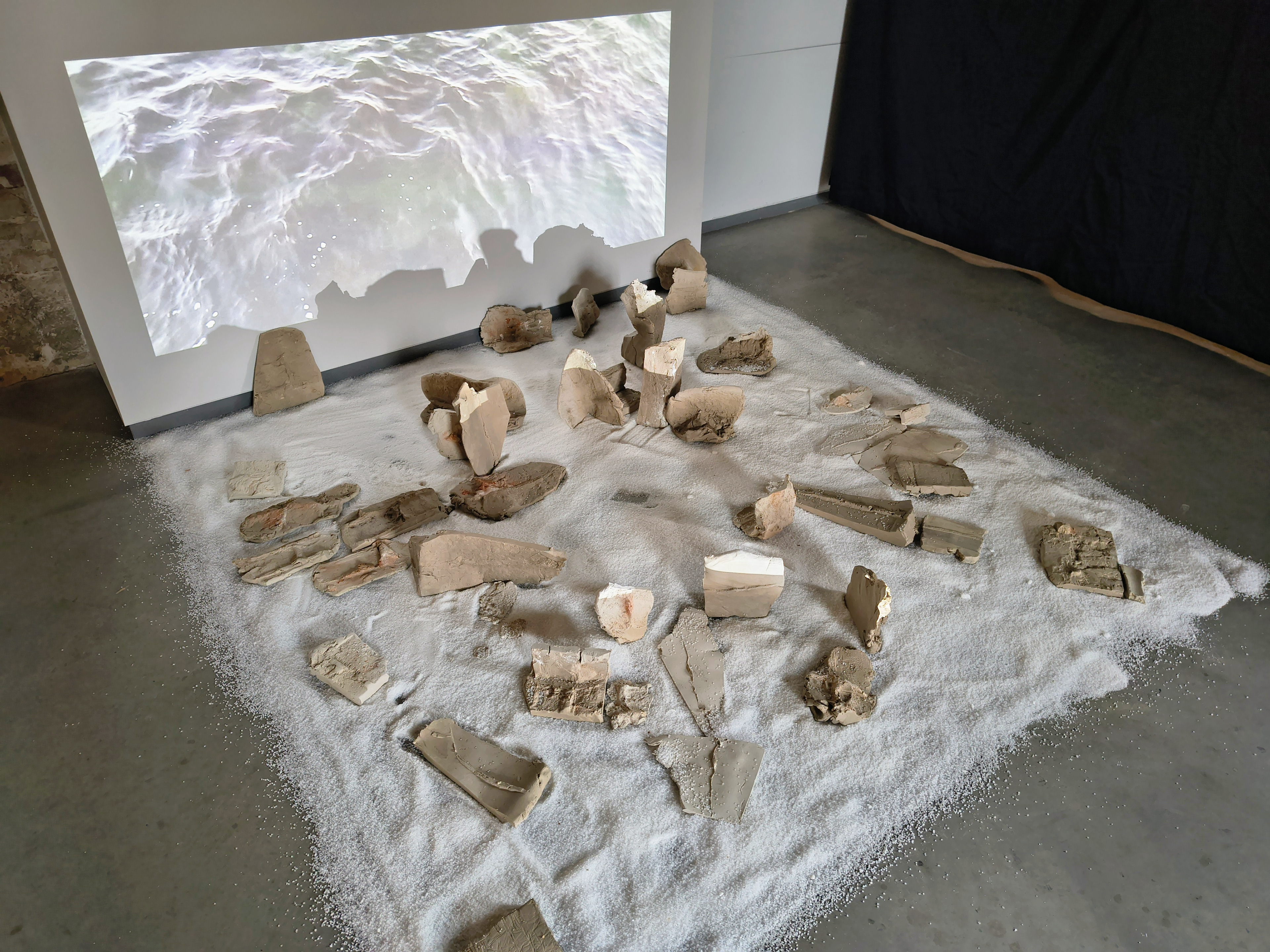 Landscape of Disappearance (2025, environment, video) An attic space filled with salt — on it, unfired ceramic casts of cracks, holes, and voids. A material staging of absence, of emptiness, which Lacan terms "the Real,” that which resists meaning. The video projection shows the surface of the Dnipro River during an air raid alert, and its soundscape combines wind, urban noise, and mounting tension. The installation becomes a ritual of presence in the face of absence, a memory-body constructed of fragility.