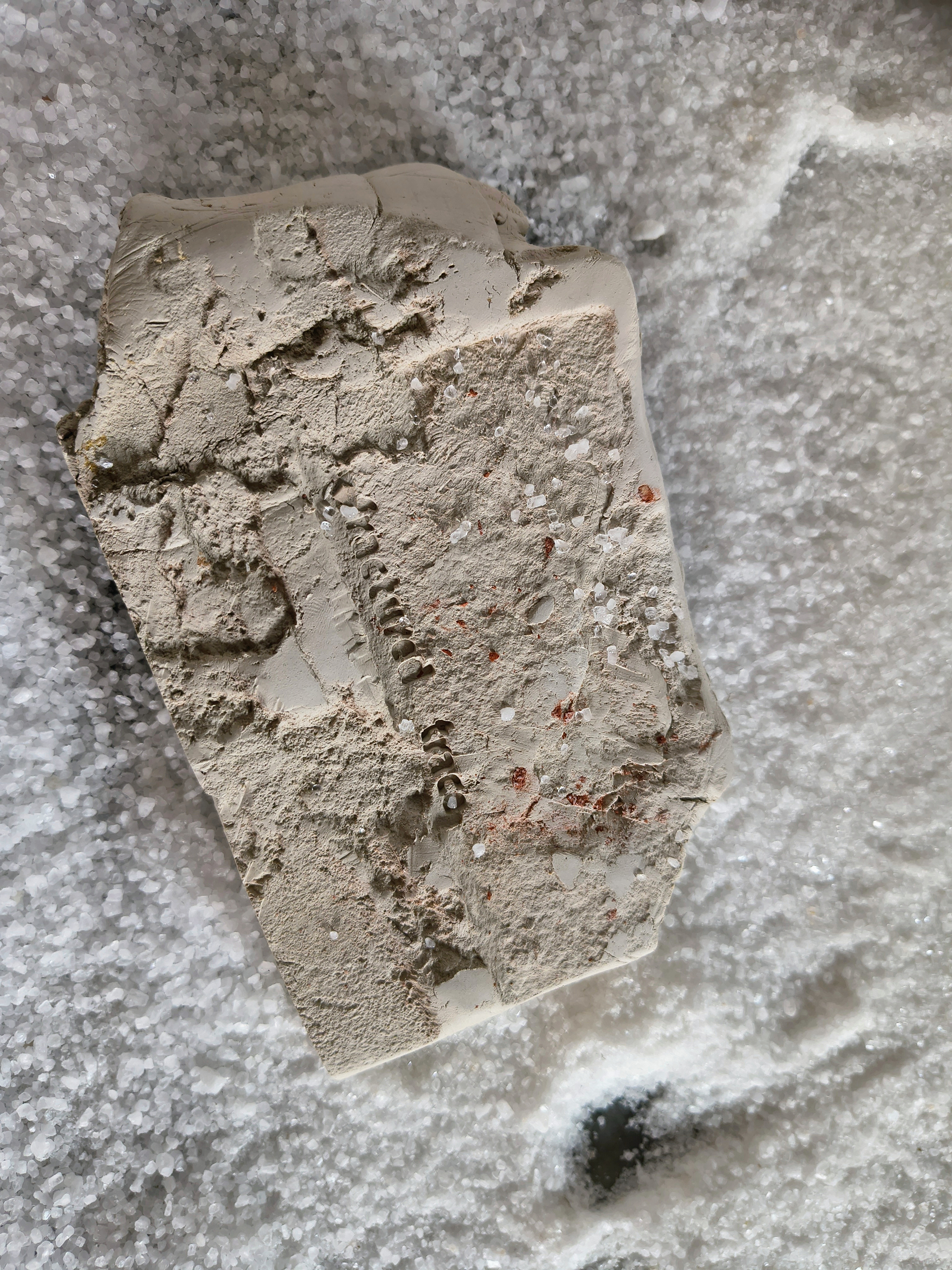 I am not interested in documentation. I am interested in matters of a trace. Therefore, I work with fragile carriers of memory. Unfired clay breaks, like the words of witnesses that have no one to be passed on to. This is an anti-archive that exists only through its vulnerability to destruction. Salt has a dual nature: it preserves and dissolves. In it, I suspend fragments of everyday life, extracted from ruins — they slowly crystallize. Here, memory is not something permanent — it is a biological, almost organic, fleeting process. The digital pixel becomes a new grain of truth, but blurred, suspended between what exists and what has been scanned and lost. As if space itself has been captured by digital entropy. Sound — not image — leads the narrative. In "Landscape of Disappearance," the video reflection of the Dnipro River withdraws in favor of the sound of wind, city noise, and the wail of air raid alerts. I refer here to soundscape studies — especially the concept of acoustic intimacy as a trace of real experience.